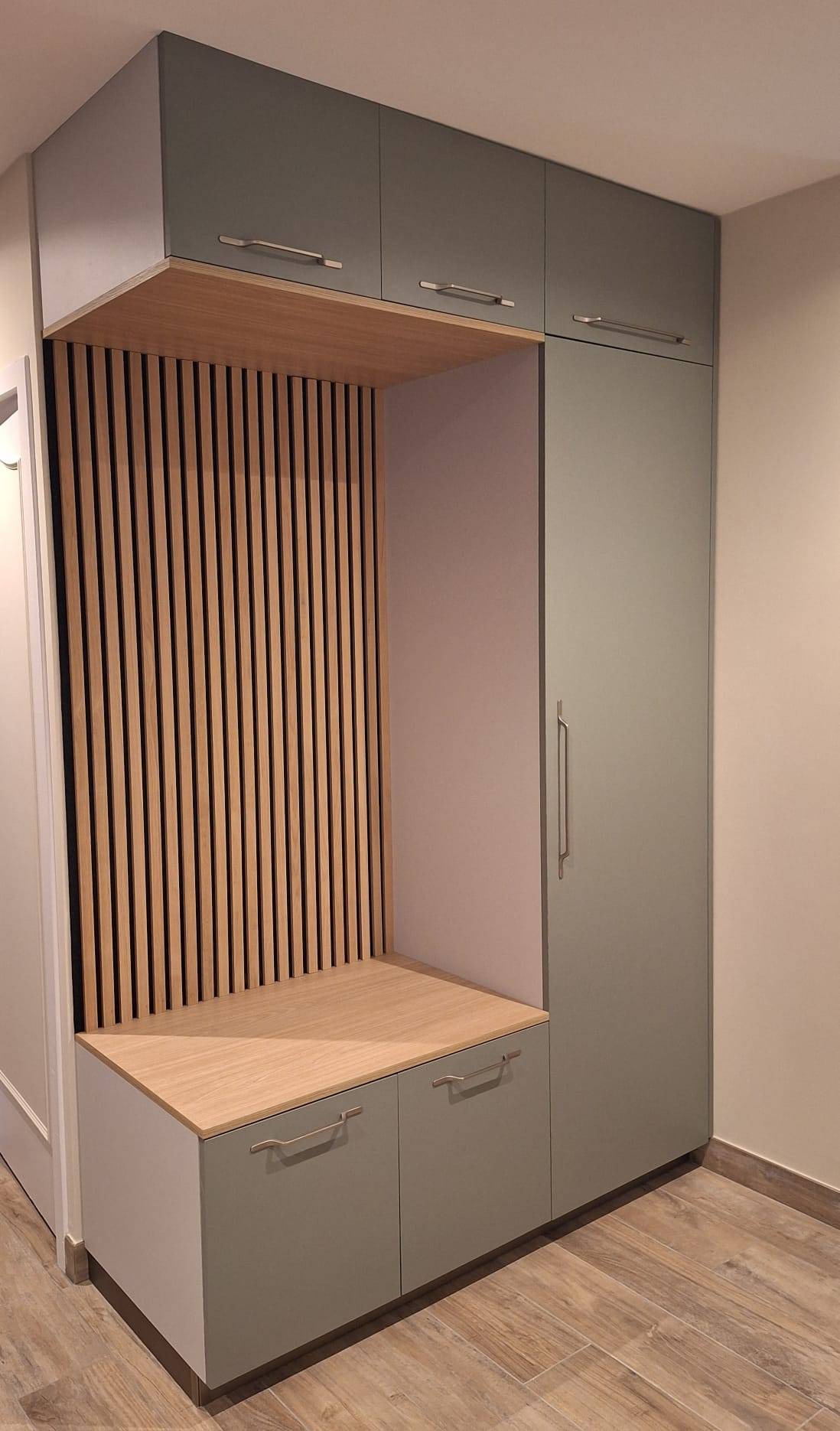 Dès le passage de la porte, l'organisation est de mise avec la pose d'un meuble d'entrée multifonction. Alliant un banc d'assise en chêne, des tasseaux décoratifs très tendance et des colonnes de rangement fermées, cet aménagement apporte du cachet à la pièce de vie tout en offrant une solution de rangement pratique pour toute la famille.