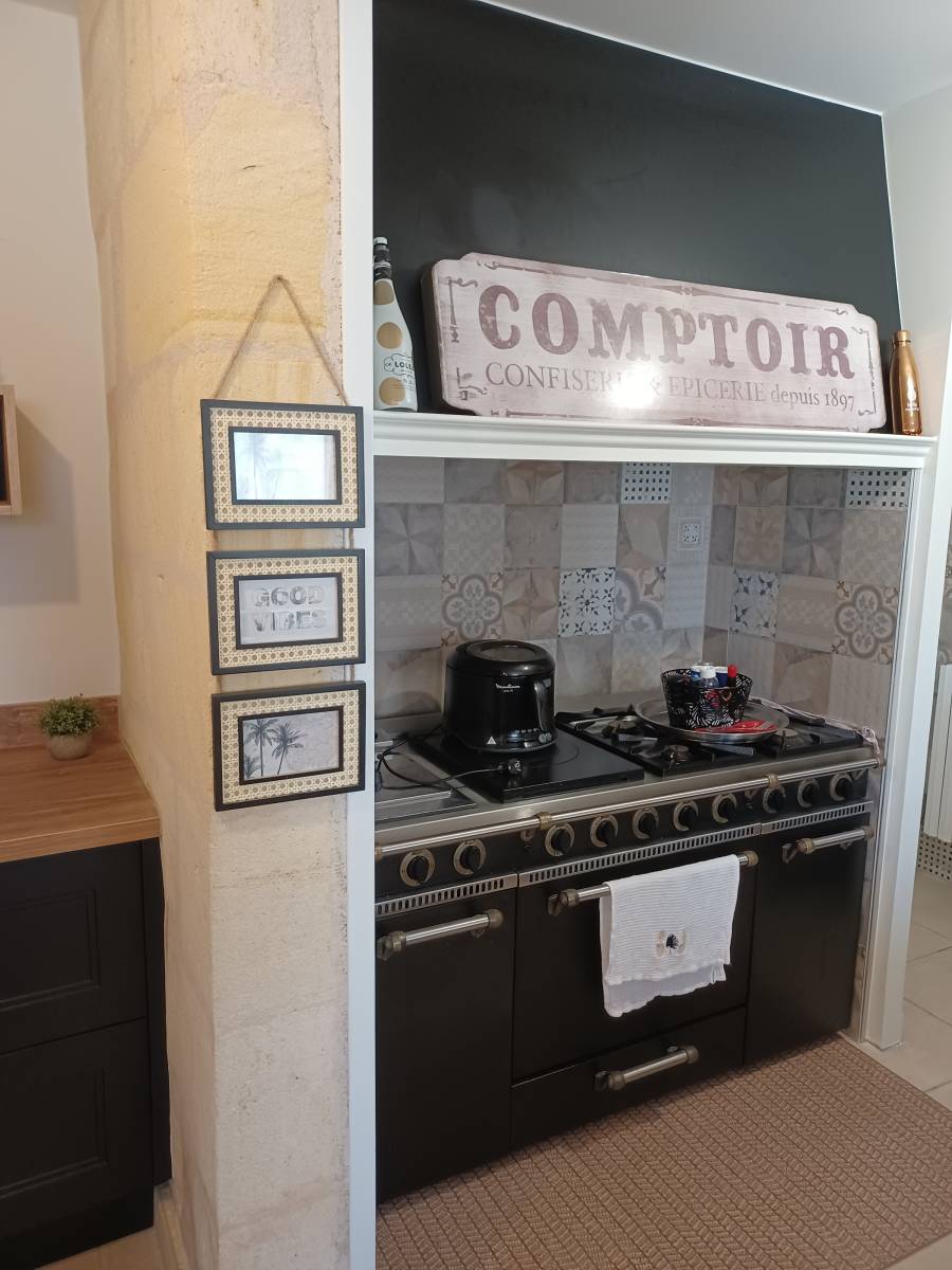 Ce client a choisi de mettre en valeur son piano de cuisson, une crédence murale en carrelage décor, et un espace repas/Snack rendant l'esprit chaleureux et convivial.