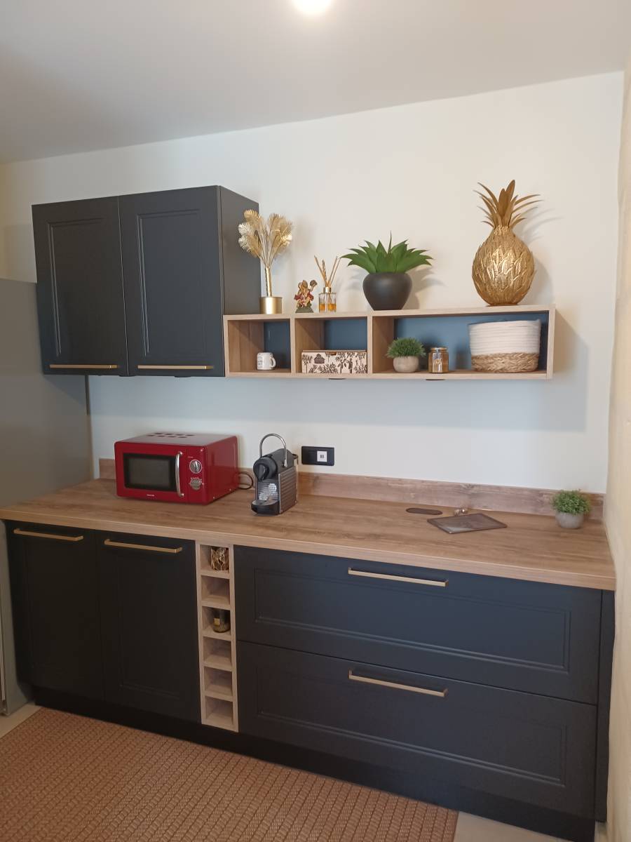 Cette cuisine est équipée de poignée champagne, mise en valeur sur des façades noir mat, de meubles hauts et niches bois assorties au plan de travail, appuyant le style recherché.