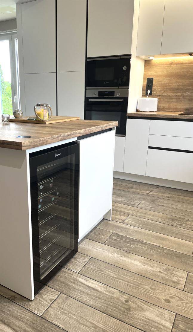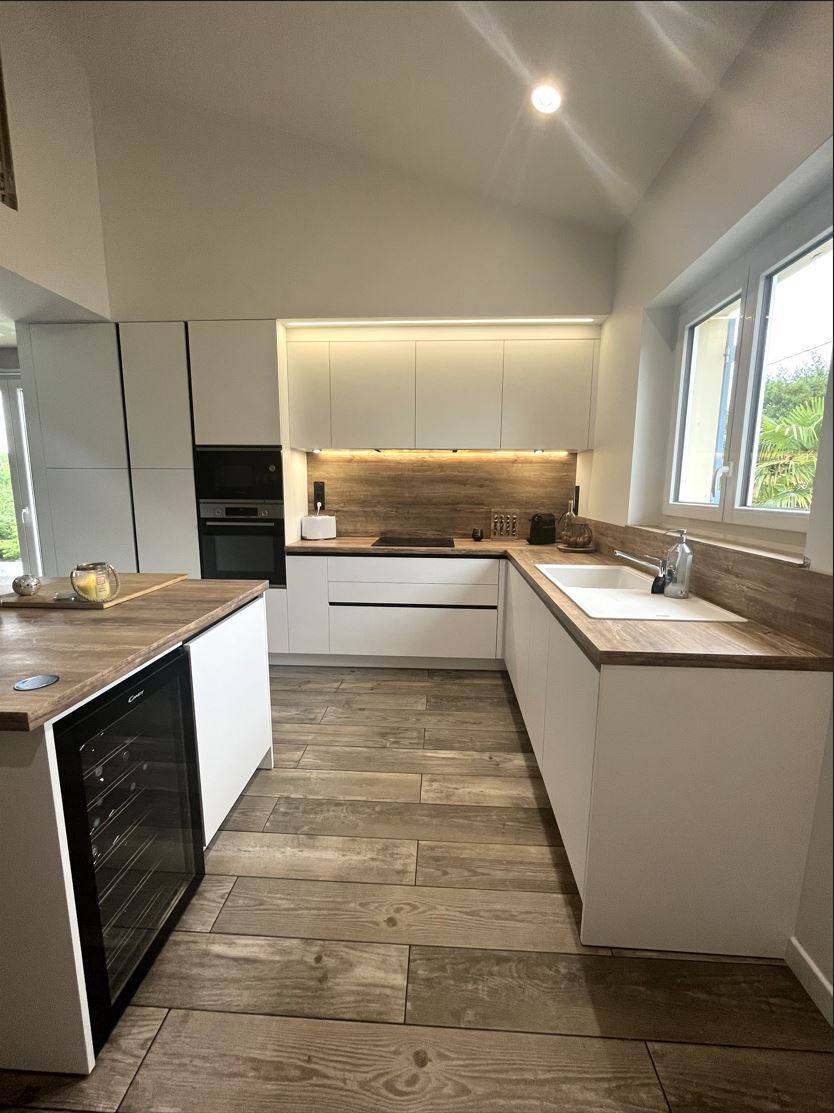 Ce client a opté pour une cave à vin encastrée, une hotte dans un groupe de meuble, et un espace repas rendant l'esprit chaleureux et convivial.