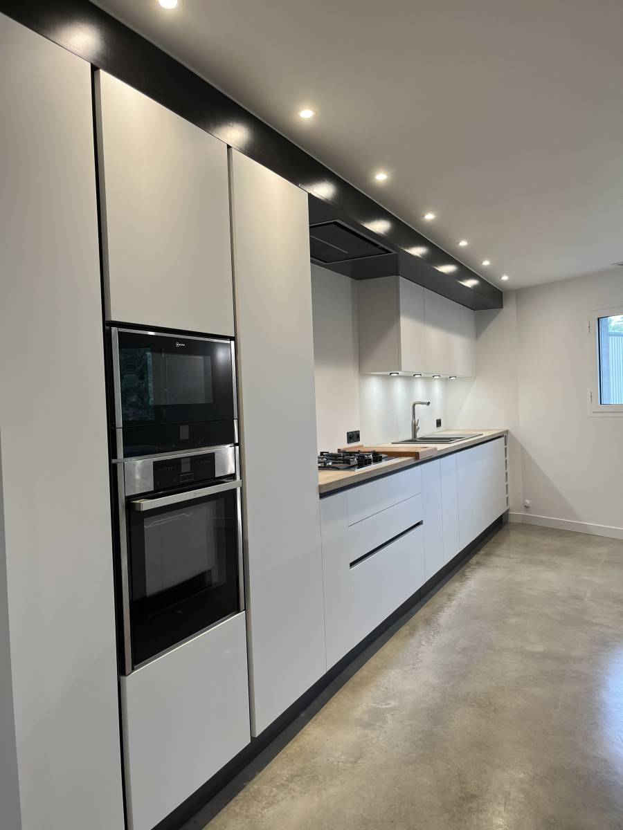 BCL Création est intervenu chez ce client du côté de SADIRAC dans le cadre d'une création de sa cuisine moderne dans un bâtiment professionnel. Nous avons choisi et conseillé nos clients sur les différents matériaux de leur future cuisine qu'ils ont pu valider grâce à des plans 3D.