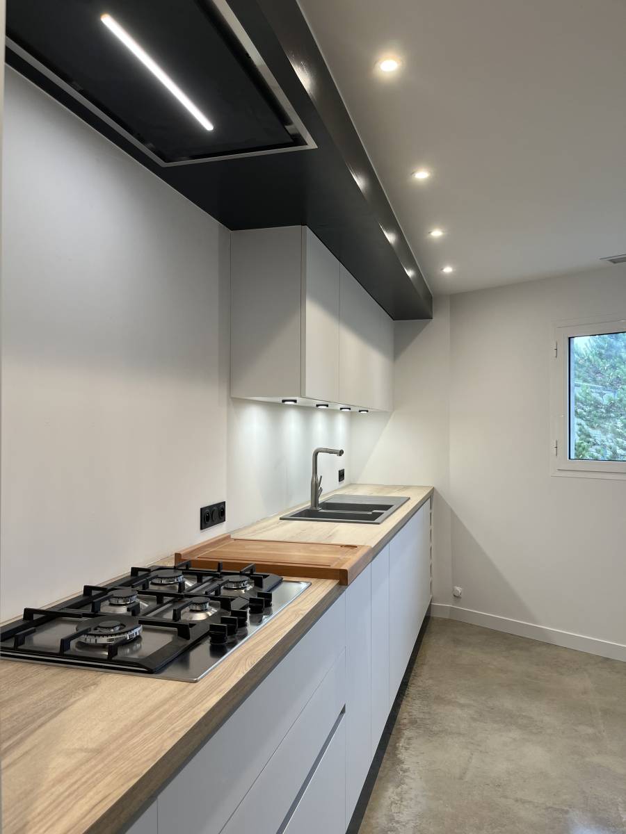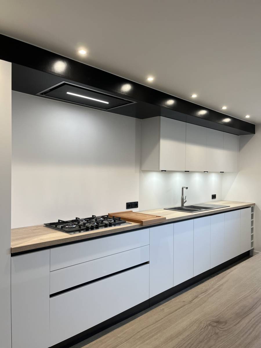 Cette cuisine est équipée d'une hotte de plafond, permettant au client d'optimiser son linéaire.