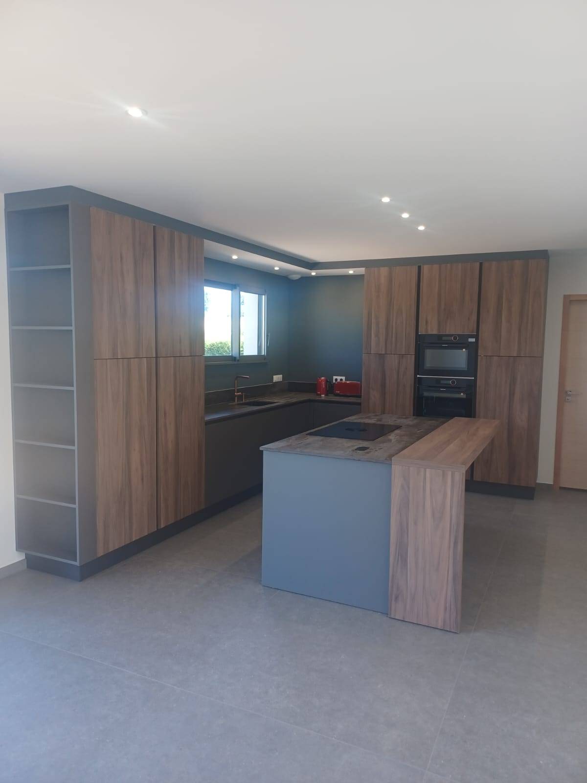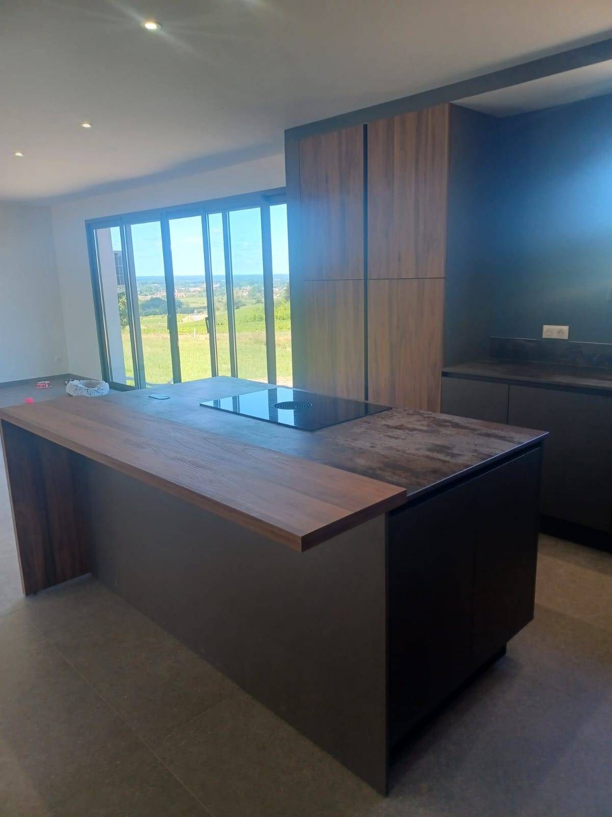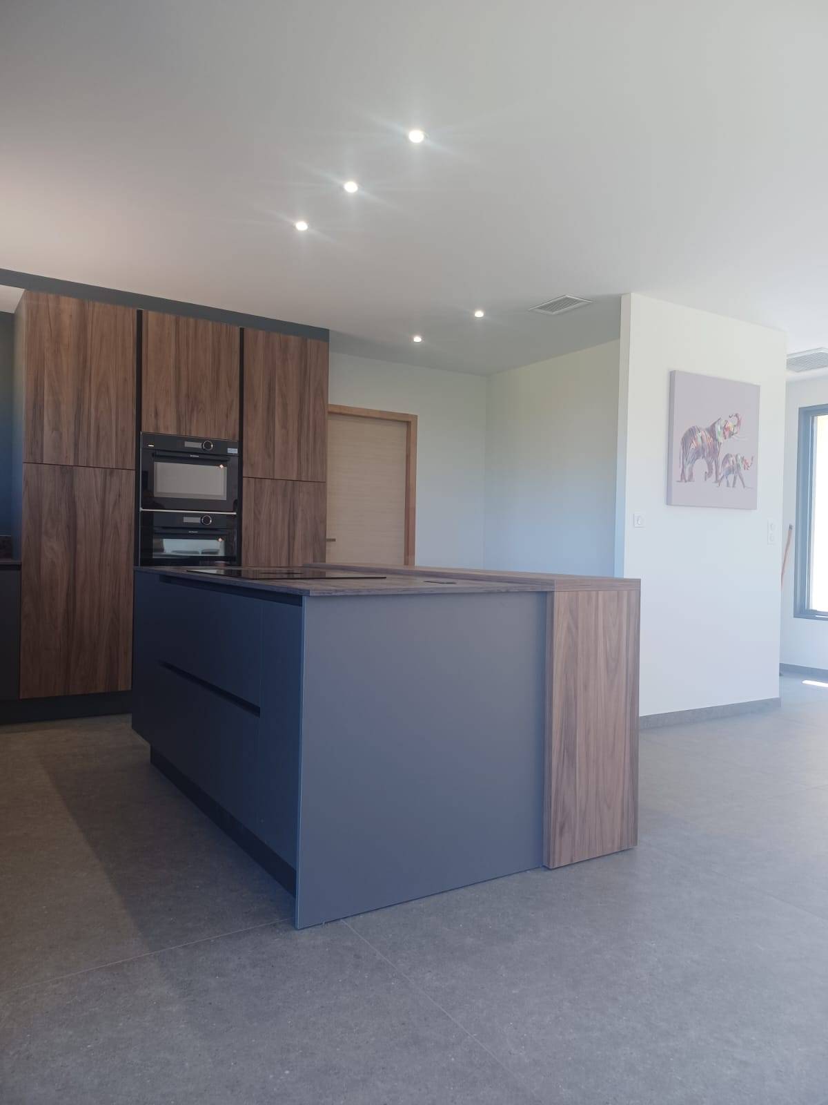 Dans cette maison neuve sur Loupiac près de La Brède, la cuisine se distingue par une conception moderne et raffinée. Réalisée sans poignée, elle affirme un style résolument contemporain tout en offrant un confort d’utilisation au quotidien.