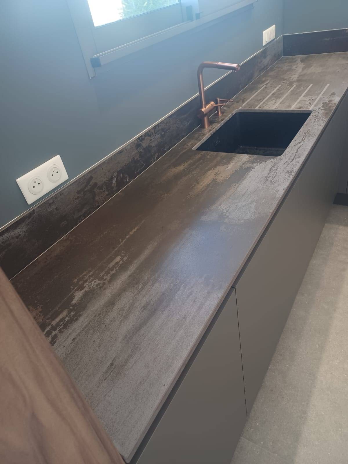Le projet mise sur la qualité des matériaux avec un superbe plan Dekton, reconnu pour sa robustesse et son aspect haut de gamme. Les armoires au plafond maximisent le rangement et apportent une belle sensation de volume. La cuisine joue sur les contrastes grâce à une bi-couleur mêlant bois naturel et gris élégant, soulignée par un bandeau lumineux au-dessus de l’évier qui offre un éclairage à la fois pratique et chaleureux.
