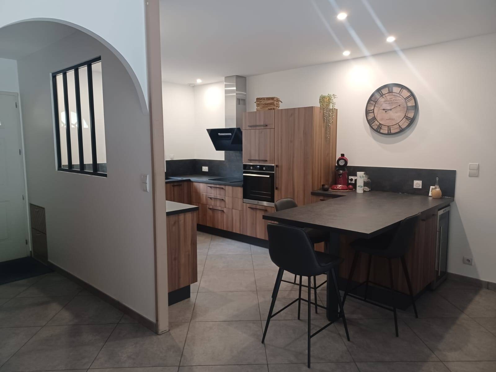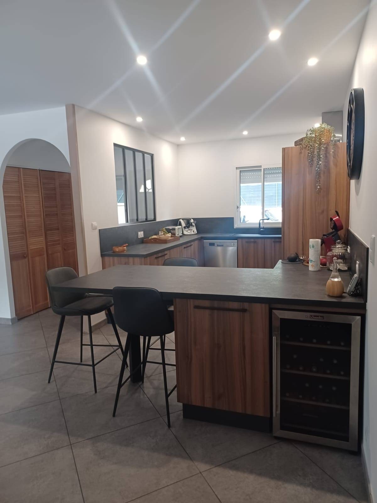 Enfin, la verrière intérieure renforce l’esprit industriel tout en permettant à la lumière de circuler, créant une sensation d’ouverture et de légèreté. Sur Sadirac, près de Camblanes, cette cuisine incarne parfaitement la tendance contemporaine où fonctionnalité et esthétique s’unissent pour offrir un espace aussi pratique qu’élégant.