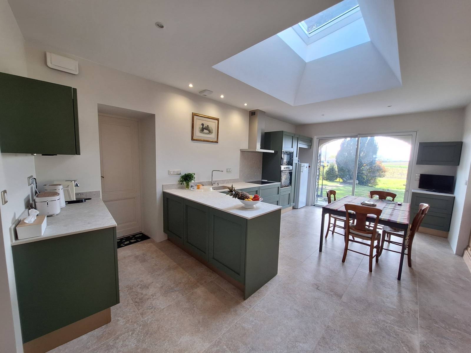 La composition choisie reflète l’équilibre entre tradition et raffinement. Les façades en frêne massif, revêtues d’un vert laqué profond, offrent un rendu chaleureux et élégant, sans poignées apparentes pour conserver une ligne épurée. L’ensemble s’insère naturellement dans l’ambiance campagne chic de cette demeure de caractère.
