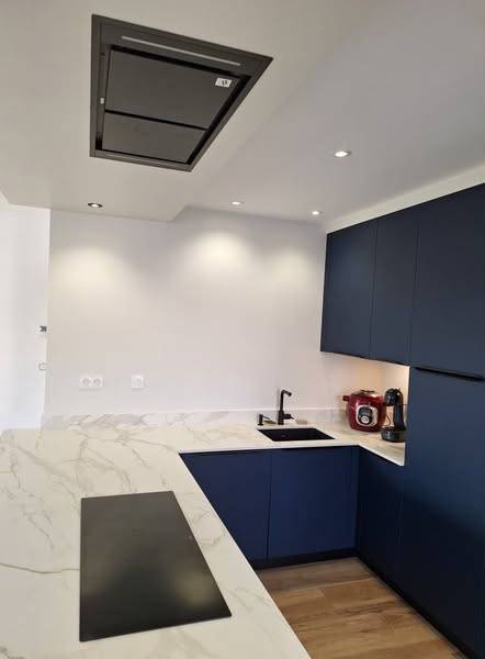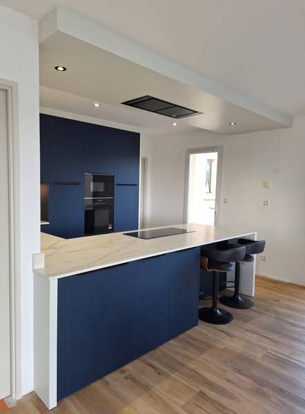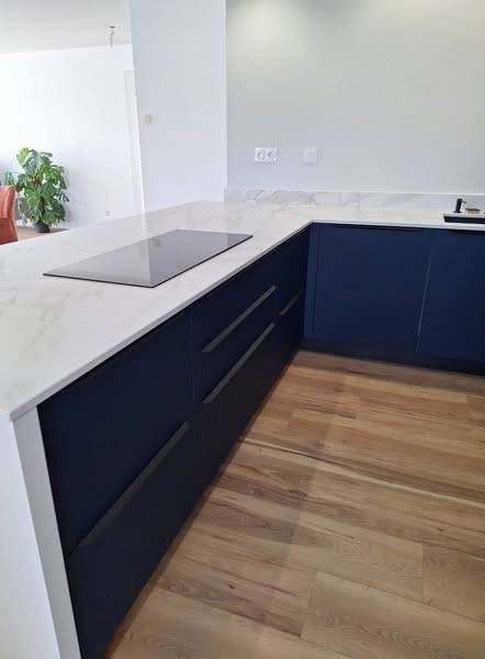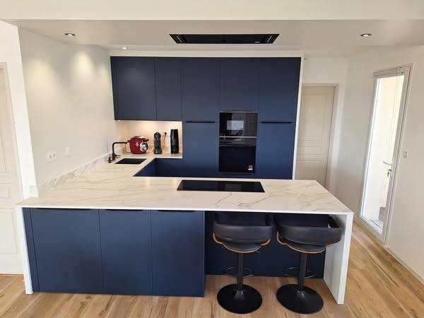 Les façades en PET bleu d’Arredo3 apportent une touche contemporaine et profonde, sublimées par un plan de travail en Dekton Morpheus aux reflets subtils. Un mariage réussi entre lignes tendues, matières techniques et ambiance chaleureuse.