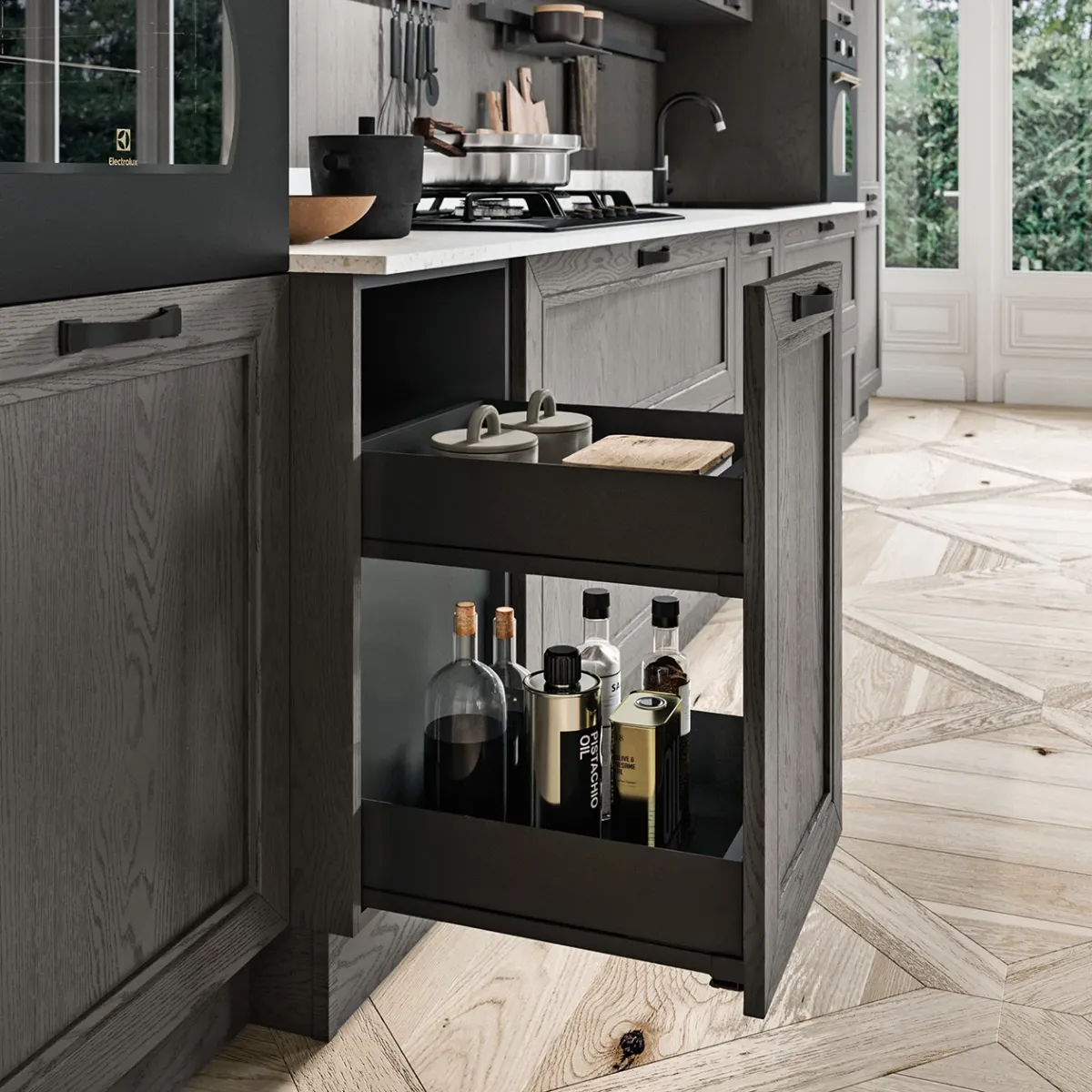 Opera est la cuisine traditionnelle d'Arredo3 par excellence. Dédiée aux amateurs de lignes classiques, fonctionnelle et spacieuse, elle allie motifs décoratifs et caractéristiques rationnelles, pour des configurations sobres et lumineuses. Elle se distingue par une porte avec cadre découpé à 45° en frêne massif, avec un profil moulé discret, et existe aussi en version à porte vitrée transparente. Les niches ouvertes, casseroliers, meubles hauts et étagères du modèle permettent également l'aménagement d’un living Opera coordonné, avec meuble TV, bibliothèque et vitrines. Son style sobre demeure classique avec les finitions laquées à pore ouvert aux tons neutres, mais peut aussi être contemporain avec les finitions colorées. Opera est définit par la sobriété classique aux motifs décoratifs discrets.