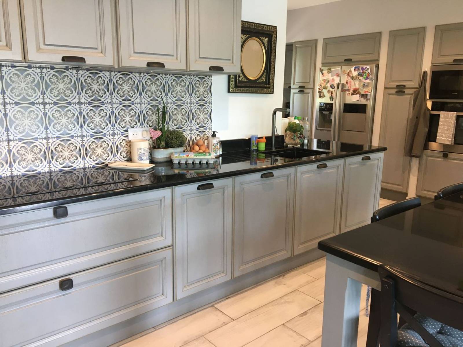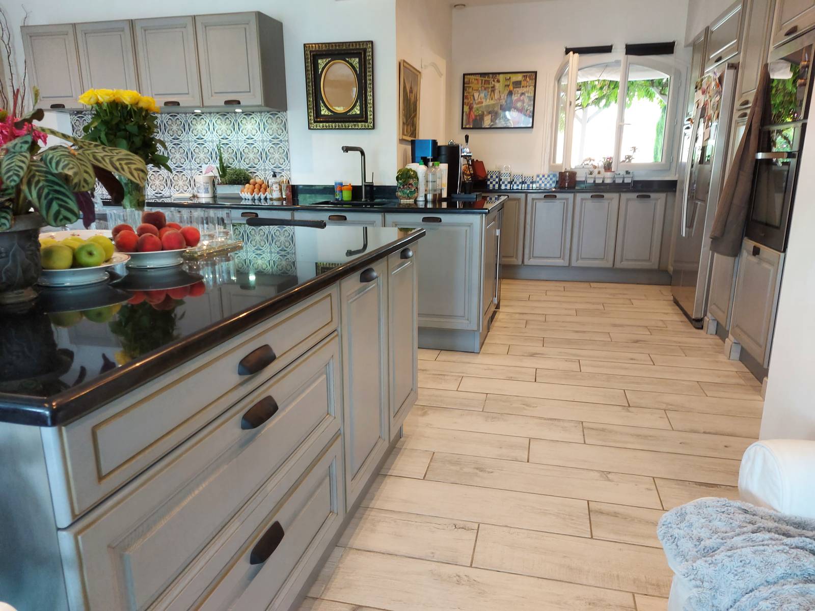Cette cuisine est équipée de "poignées coquille", fixées directement sur les façades à cadre donnant un côté traditionnel à cette cuisine.