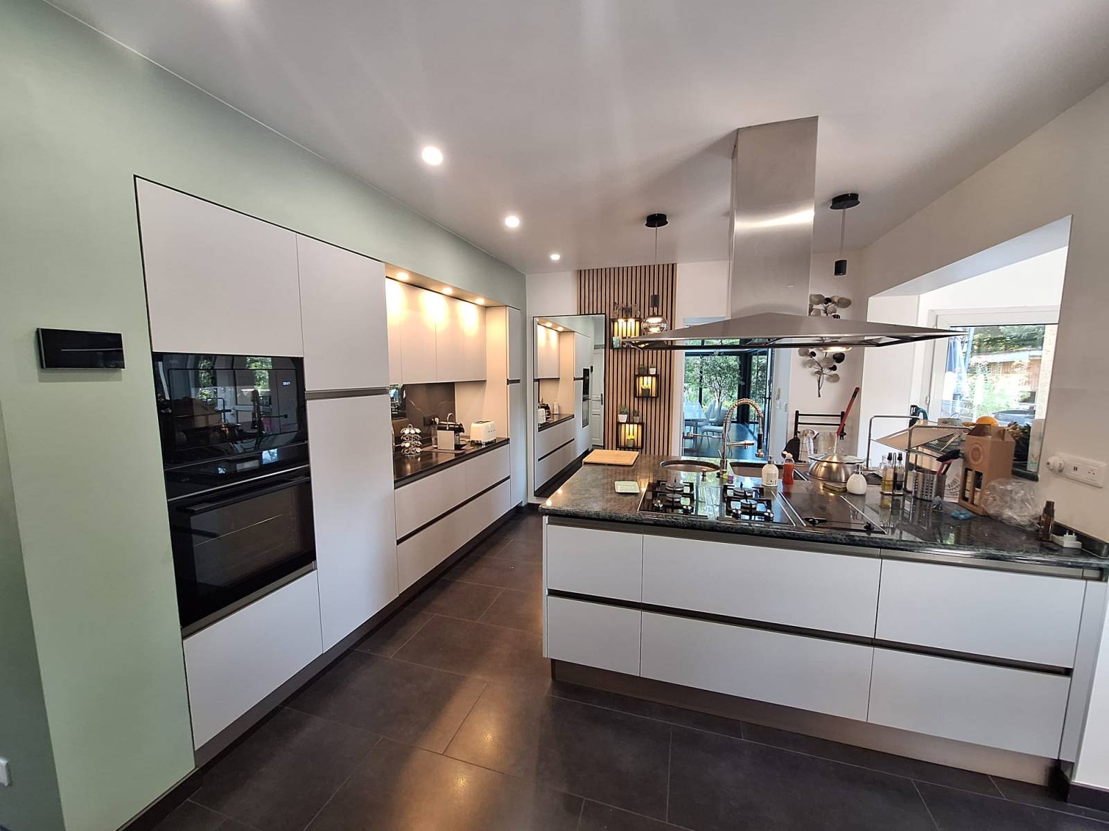 Le parti pris de cette rénovation repose sur des lignes droites et des façades blanches sans poignées, qui apportent une esthétique sobre et contemporaine. L’îlot central se démarque avec son plan de travail en pierre sombre, apportant contraste et élégance tout en servant de véritable cœur de la pièce, où se regroupent cuisson, préparation et convivialité.