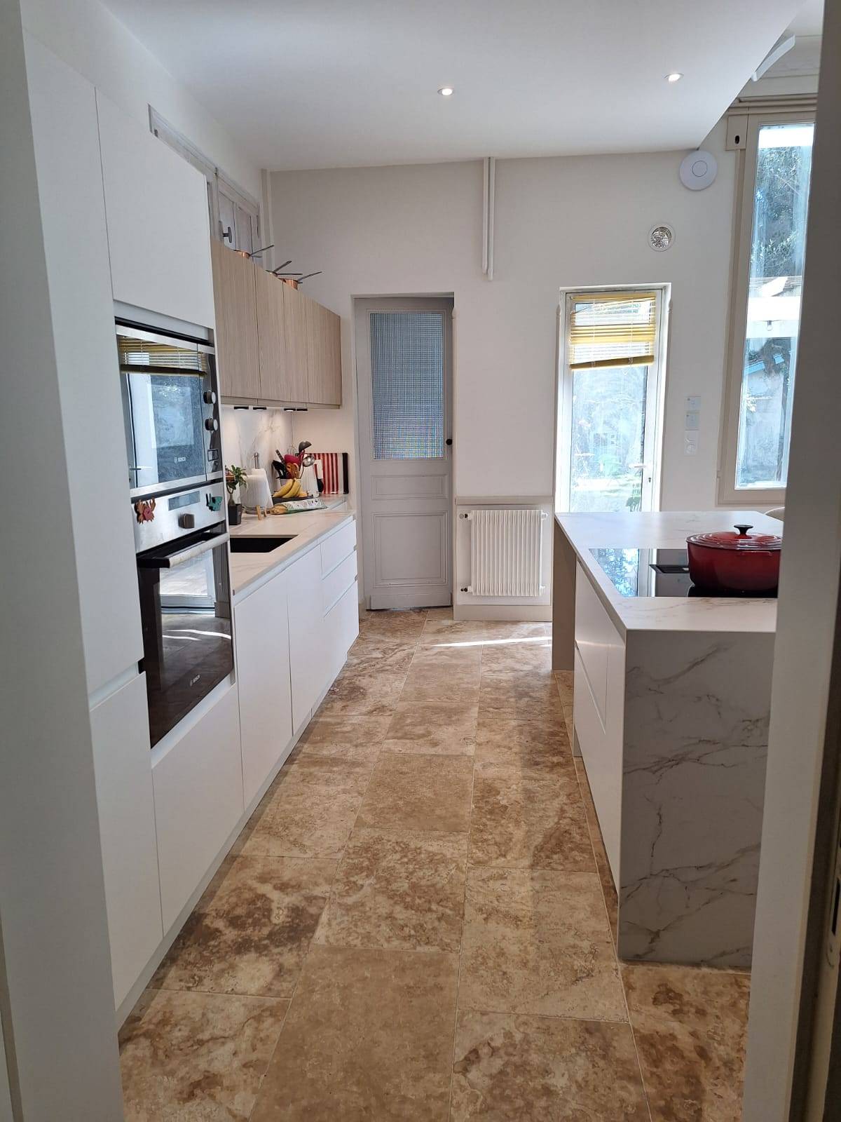 Pour ce projet au Bouscat, le choix du revêtement de sol s'est porté sur un magnifique sol en travertin. Cette pierre naturelle, aux nuances beiges et chaleureuses, apporte un cachet inégalé et une authenticité qui traverse le temps. Elle se marie parfaitement avec les lignes épurées des meubles de cuisine blancs et bois, créant un équilibre parfait entre tradition et modernité.