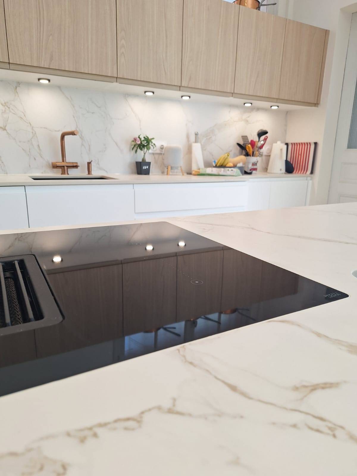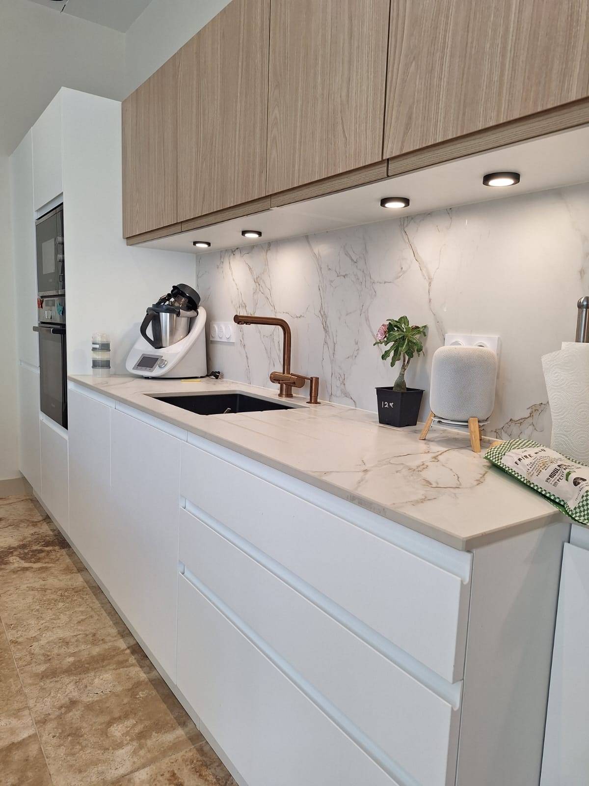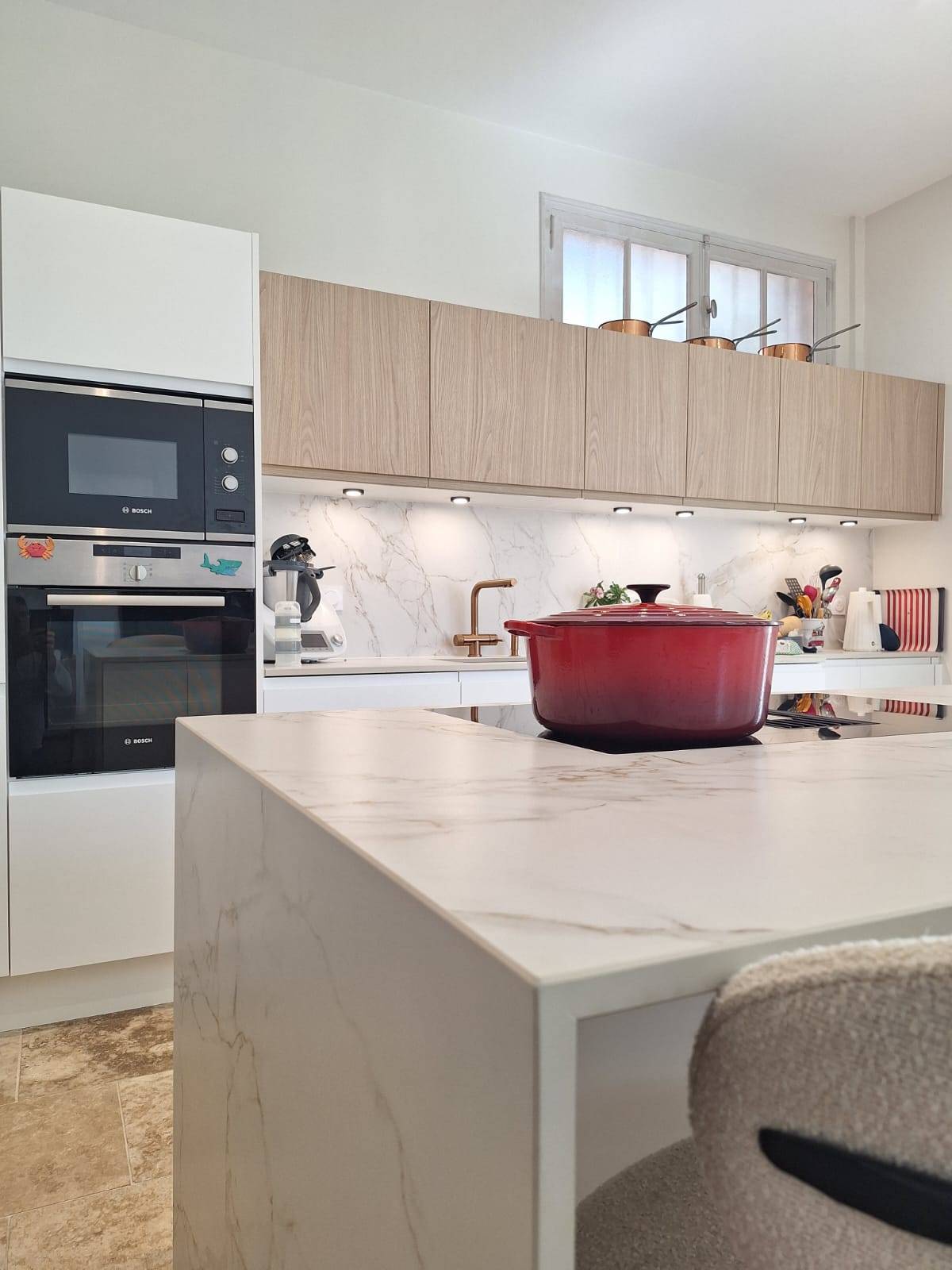 La pièce maîtresse de cet aménagement est sans conteste le plan de travail en Dekton effet marbre. Ce matériau ultra-compact, réputé pour sa résistance extrême aux rayures et à la chaleur, offre l'esthétique luxueuse du marbre blanc sans ses contraintes d'entretien. Nous avons poussé le détail jusqu'à réaliser une retombée en cascade sur l'îlot central, soulignant l'élégance de la structure.